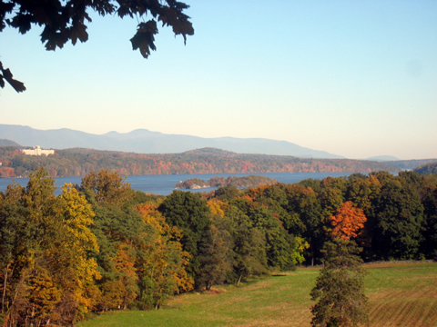 The Hudson is an impressive river. It flows south from the state’s highest peak in the Adirondacks, gradually widening through the Hudson Valley, and its the valley’s defining hills and mountains which put on the great October show. I took the train up to Syracuse, stopping in Poughkeepsie, and the train rolls right next to the river. The trip on that sun-splashed perfect October day was spectacular.
