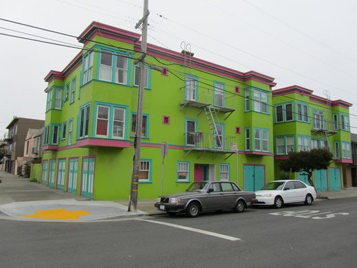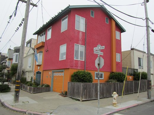 As we ambled along the “outer Forties”, 45, 46, 47th Aves, just shy of the beach, I was struck again, by the quiet. Parallel to the ocean, and thus away from those heading to the beach, there were few signs of life. Did pass one home with half open garage door, saw feet, heard music, smelled pot…………skipping school I thought…..what an awesome place this must be to do that, this warm fog blanket a perfect elixir for your teen angst. Much of this part of the City was developed in the first half of the 20th century, and there is much repetition to the homes. The basic model a garage with adjacent stair up to the living floors, and a little patch of lawn out front. The corners depart from this model, and they provide slightly more interest to the streetscape. It was eerily beautiful walking through these avenues on a Wednesday morning. The solitude, the hushed tones, the repetitive beige buildings, and then….COLOR!!! Explosions of color in fact. And not just color, blinding combinations, defying the fog, generating their own heat…blinding.