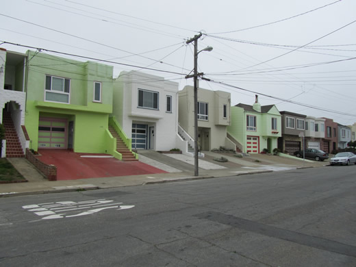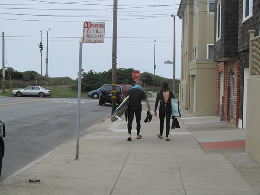 At Noriega, we headed inland. There is, not surprisingly, a sub-culture that lives in the Outer Sunset. Like much out here, it seems about as far away as one could get from Mission Hipsters, Food Carts, Nob Hill dowagers, Fi-Di stockbrokers, and so on. Just on this little walk, ran into a number of surfers, commuting to, or from, the beach. This neighborhood bears little resemblance to anything else in San Francisco, it has more affinity to Santa Cruz, and some of the scruffier Southern California beach towns (save the sun), places where the elements batter the buildings to a withered and weathered state of just enough to keep dry, but its ok, because, after all, we’re here for the surf. In fact, even the new Tsunami Evacuation signs have been doctored up, suggesting that perhaps a Tsunami could represent a once-in-a-lifetime recreation opportunity for the local populace.