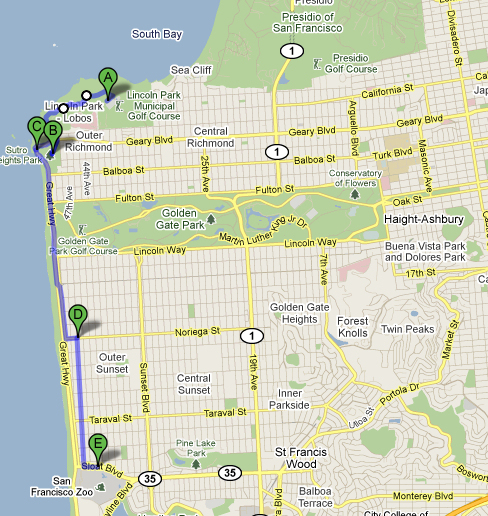 In the heat of it one day(?), we, instead of following the natural inclination to flee this cirrus invasion, dove into it, heading west for a journey along Ocean beach and its surroundings. Here’s the route: