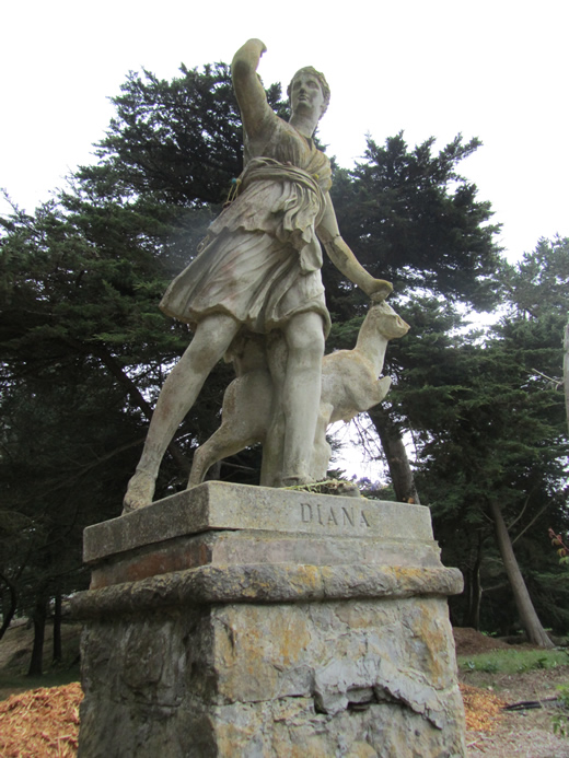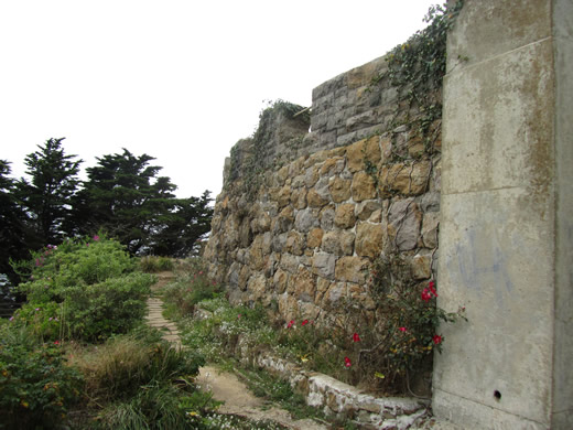 Rolling around the back of the museum, one can explore the urban wilds of Land’s End, a truly remarkable place in its own right. Eventually, all paths spit you out at the old Sutro Baths site. There, windswept tourists, baffled as to what happened to the sun that regaled them in Union Square moments ago, braced themselves against the wind for the requisite Seal Rocks snapshot. The Cliff House is worth a stop, if only to sip a delicious Ramos Fizz at the bar on a windswept day. But instead ,we ambled up above the Cliff House, to Sutro Heights Park. Once the site of the oceanside home of Adolph Sutro, it is the ruins of his lavish Italian styled gardens. It was turned over to the City, and today it is a relatively little know park. On this day , it oozed melancholia, overgrown vegetation trying to reclaim slightly ruined walls and some faded statuary. This was a Wednesday morning, and the only others there were a couple of old Russian women. (It was rather Siberia-ish this day). From this promontory, one gains a commanding view of Ocean Beach, and on this morning, it was deserted.