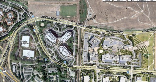 I was not sure where the ‘campus’ began, or when I had entered its hallowed grounds, but suddenly two people whooshed past me- and not in a car, but on bikes, painted suspiciously with Google’s telltale rainbow. Then I saw a sign, then another, and that was it, I apparently, had arrived. I was underwhelmed- it did as it turns out have the styling of a very bland 80’s office park. In fact, here is it what it looks like from the air , and of course, courtesy of GoogleMaps ™:-/ :