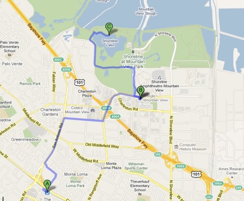 A couple of months ago, I set out on my latest “Grand Tour” Amble. But this was no ordinary amble, no this felt more like a journey to the center of the earth. For on this day I was traveling to Google’s world headquarters, or as it has come to be known, the “Googleplex”. Here’s the route, and as always, it was accessed via public transit, in this case, via CalTrain’s San Antonio station, and included a sojourn out to nearby Shoreline Park. Here’s the 5-milish route, and, of course, courtesy of Google ™ :-/