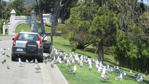 Once I was done with Joe, I made my way back to the road and headed to the end of this amble. I passed the edge of the pond, and there were the birds again, assaulting a car. Now I understood why -the people in the car fed the birds prodigious amounts of food. As I passed a few started following me. I channeled my best Tippy Hedren and backed away, slowly.