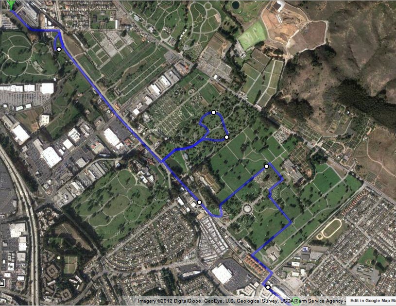 This walk is actually fairly convenient from BART, as you can take it to Colma, walk thru town, and end at the next station; South San Francisco. Here’s the route, and as you can see, it’s mostly cemetery: