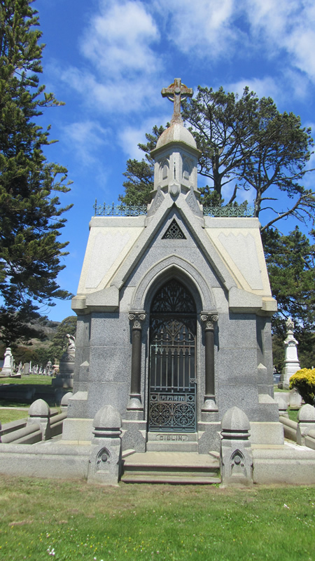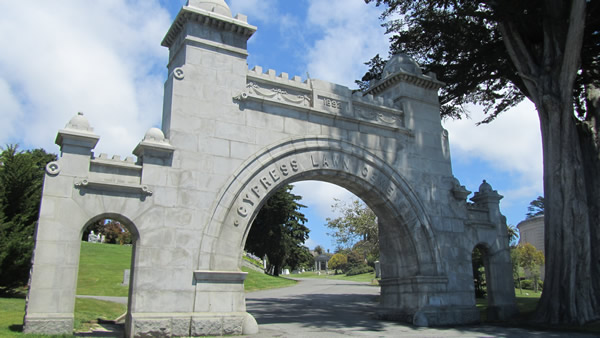 My main destination this day was Cypress Lawn, a large and scenic cemetery on both sides of El Camino Real. I focused on the east side. A good cemetery layout ideally combines varied topography, along with enough mature trees and landscaping to highlight the monuments. And of course, it therefore requires enough of a monied populace to erect massive crypts, and that wasn’t a problem here. So up I went, passing several idyllic looking ponds, not a person in sight, but what seemed like thousands of birds. They all flocked to me as I walked. They kept pace with me for a spell, to the point that I became a bit concerned. Then a car pulled up and stopped behind me, and the birds swarmed the car. I ran through this gate.