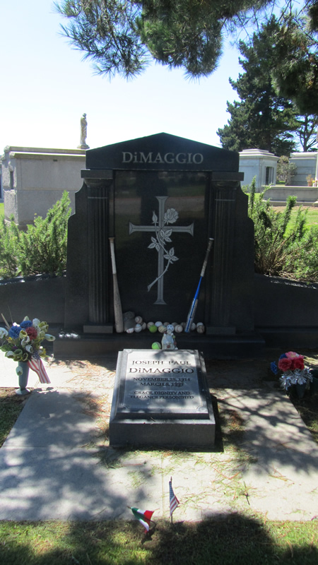 Another draw to the cemetery is a pilgrimage to the grave of the famous, or infamous. There are many well-knowns in these cemeteries, I had seen William Randolph Hearst’s tomb, and even Wyatt Earp. But I had one grave on my list this day. It was a few cemeteries down on the mall, Holy Cross, a predominately Catholic cemetery. I was looking for the Yankee Clipper, Joe Dimaggio. It was not hard to find, in fact its popular enough that they have added a parking space nearby. People leave bats , balls, gloves, and no doubt many wishes that Joe might bless their swing, or cure them of their slump.