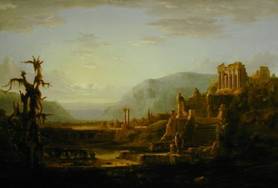 My mind wandered to inspirations for this setting,that is the classical temple in the landscape, and the painting of the Romantics came to mind. For example the American Thomas Cole, who captured well the spirit of the eternal – fading light on a fading empire: