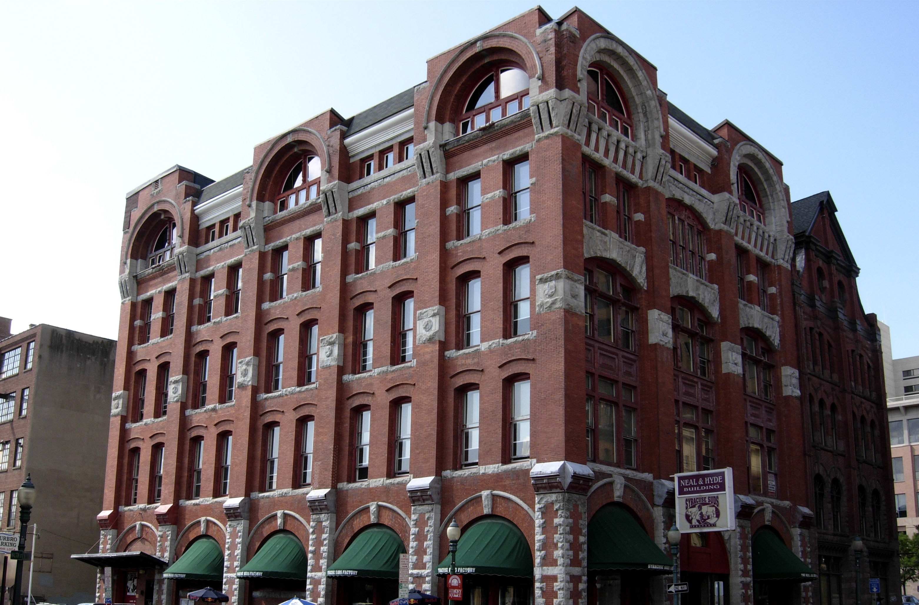 As the walk gets to downtown and emerges from its channel, one gets an up-close view of some of Syracuse’s finest buildings. At the center of the old city, the utilitarian brick of the factories gives way to the finely hewn stones and flights of masonic fancy: