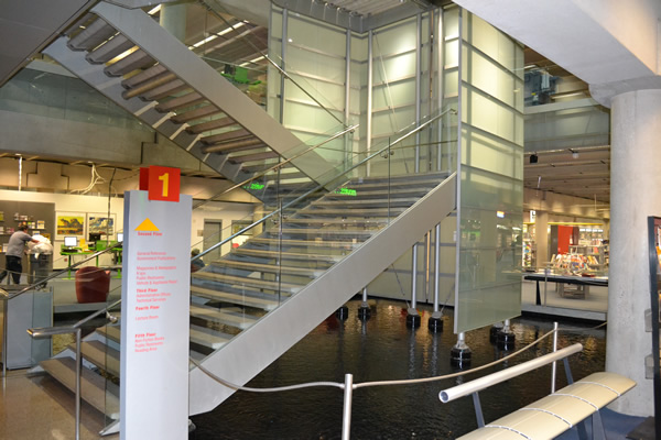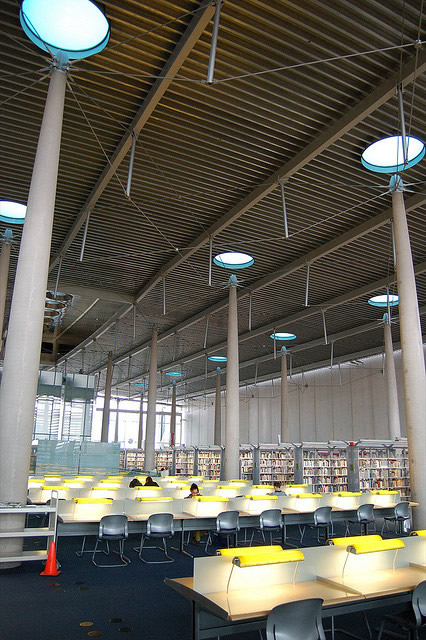 Of course, one of the most appealing, and occasionally disarming , aspects to a public library, is well, its publicness. It is for one and all. And so I saw, as always, kids doing research or getting inspired, a senior sitting by the pool reading, a guy watching porn, and someone else, well, bathing. And on the top floor, I looked forward to seeing the capper, a huge reading room under the tensile structure, always my favorite feature of a good library. The space was cavernous, and left me wanting: