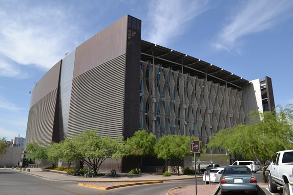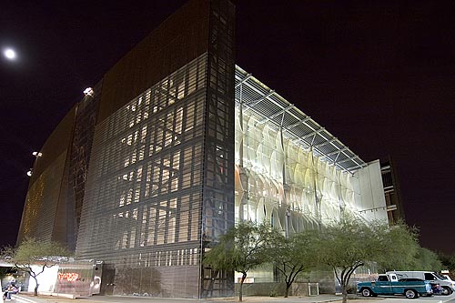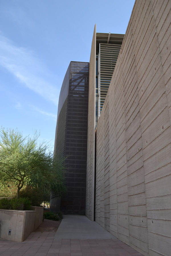 The main library was designed by local Architects Will Bruder and Wendell Burdette. I resisted the temptation to immediately go inside on this hot morning, and as it would turn out, with good cause, because I found the exterior most interesting. Basically, the building is a box, with solid gently bowed copper sheathed walls facing east and west, and full height glazing north and south. This is a view of the north facade, one that features fabric sails that deflect the early morning or evening summer light. The south elevation is also glazed, but it features operable louvers that were understandably closed.