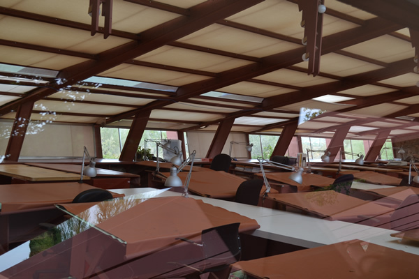 This really was a camp in the desert, in fact, initially the place had no windows, though eventually, even the colossally stubborn Wright acknowledged this didn’t work. My shining brow now had several welts on it as we ended at the drafting room- Wright feeling tall ceilings were a waste of material. I tried to imagine what it would have been like to go to school here; broiling in the mid-spring heat of the drafting room- having to explain to Mr. Wright that the mark on my trace he was apoplectic over was actually a recently expired cricket.