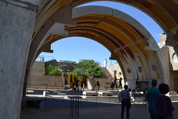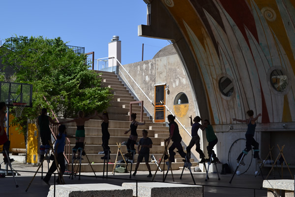 There was faint strains of music coming from various locations, and on this windy day,there was a cacophony from Soleri’s bells . We made our way to a final apse, a space for community gathering. A performance group from South America was practicing for an upcoming event here in a few weeks. On stilts, the music wafting in the now strong wind, dancing in the shadow of the apse- a dream interrupted I suppose, it was, in that moment, incredibly beautiful.