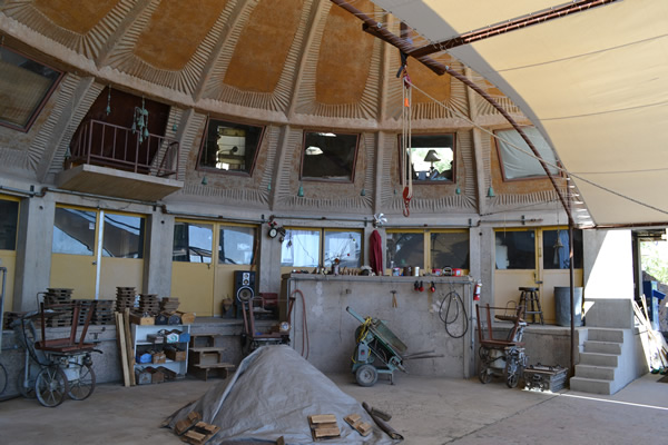 So yeah, they’ve got a ways to go. Like Taliesen, Arcosanti can only be seen on a tour, and again, off I went with a very small group that had found their way to this remote outpost. A volunteer and resident took us on a tour. There is a smaller group that stays and works there now. Work does continue on the complex, but it seemed a lot of the work is devoted to the production of Soleri’s famous bells and chimes, an operation he devised to raise money through their sale.