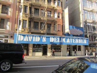 Further up Taylor, anchoring an edge of the Tenderloin at Ellis Street, sits Glide Church. This marvelous institution is literally a beacon, serving up meals and hope daily to the neighborhood residents. Feeling bugged that your 401-K took a hit, or you have to work on Saturday? Go serve some meals there some Sunday morning and get back to me about those problems you’re having. The church also marks a transition in our walk , from the Tenderloin to the Theater District and beyond. At Geary, we take a right for a quick detour down one block to Mason. Here we sample a bit of the Theater District, a tiny slice of Manhattan. Worth a stop, the counter at David’s Delicatessen (more for the ambiance), and ponder the fruit and vegetables adorning the Geary Theater, home of ACT, across the street.