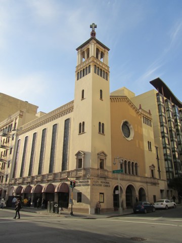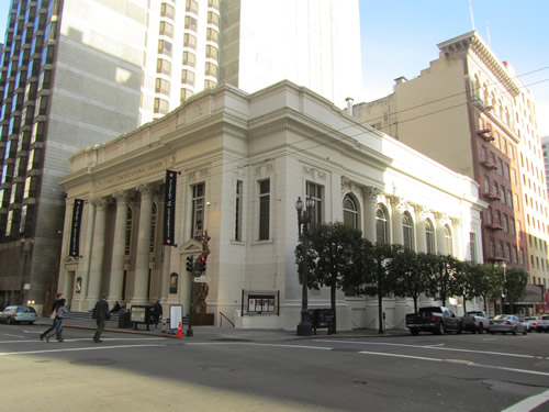 A left at Mason, and we go up one great urban block, one that includes the nostagically named “Native Sons” and “Spring Valley Water Company” buildings, and at the corner,The First Congregationalist Church. There is great power that comes from the white temple that sits amidst the surrounding gray highrises, another very Manhattanish motif. One could usually count on these temples to offer a moment of quiet repose from the workaday world, but it is now part of the Academy of Art Empire, a real estate conglomerate masquerading as an art school. It is no doubt now some sort of classroom. While I love the student presence in the neighborhood, I am stunned in this city where a deck addition can spawn a neighborhood revolt, they have gotten away with what amounts to a bit of unplanned urban campus building that routinely displaces the locals. (I mean how many art schools have a luxury car collection).