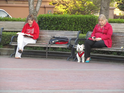 Of course, the park is dominated by Grace Cathedral, always worth a visit. After ascending from the Tenderloin, a visit to the labyrinth inside could be in order. However, we’ll focus on Huntington Park across the street. The park , as most are, is home to a variety of indigenous wildlife, including the speckled dowager, the blue-blazered dandy, the red-sweatered seven sister (seen here) ,and also, in summer only, the camera-toting shivered German Warbler. As a neighbor, I periodically bring the legendary Whiskey (the dog, not the drink) here to mix it up with some of the precious specimens from the park. As one sits here around the fountain, contemplate where you were not 20 minutes ago. Like these three: