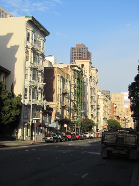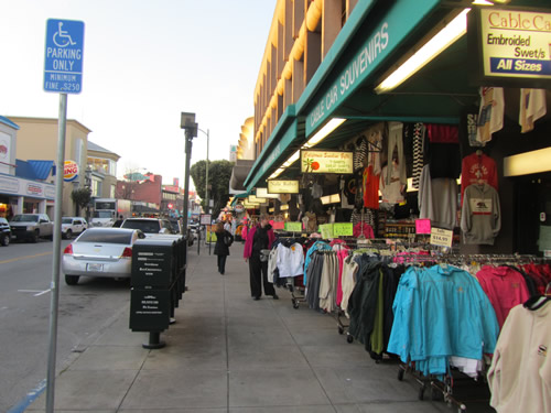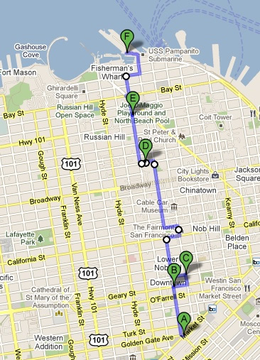 During the past year, I have described travels down a single street, and the changes one encounters along the way. We traveled from the bottom of Market Street to the top, and journeyed up Polk Street from one end to the other. I took that up again last week, getting out for a trek along Taylor and Jones Streets. It started amidst the insanity of Mid-Market , shimee-ed up and over Nob and Russian Hills, and then spat us out in a different kind of mayhem; Fisherman’s Wharf. Here’s the route: