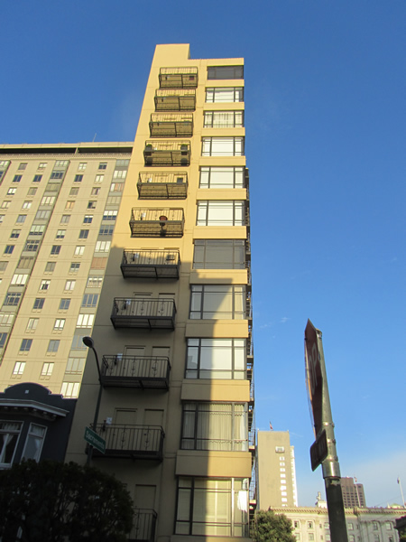 In addition to the hotels, people live here, and there are some exquisite buildings, none better than this toothpick at Taylor and Sacramento. It contains one small apartment per floor, you get out of the elevator and voila, there you are. Nob Hill livin’.