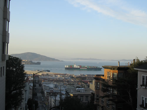 Well dear ambler, we are nearly done. Having taken in the bay, some art, having meditated on our evolutionary journey sitting by the courtyard fountain, we know all good things must come to an end. As we descend first Chestnut, then north on Jones (and on the corner, Scottie’s 40ish home from Vertigo!!) we contemplate the cross-section we have cut. The franticness of Market, the hustle of the theater district, the repose of Nob and lushness of Russian Hills, and now as we waft the first bits of the bay, we