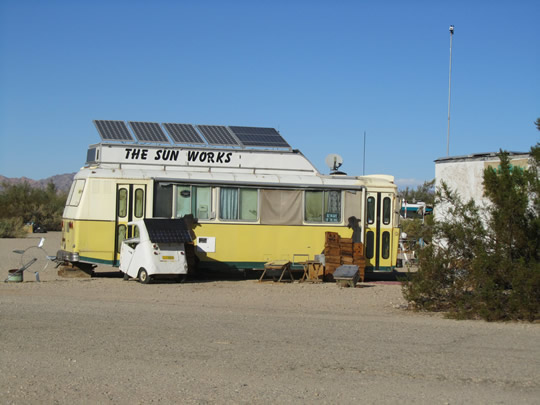 Well away from the madding crowds of the desert cities, one can see this all flipped around. There is no war with the desert, the desert has, in effect, won. Here , in the places “the interstate missed”, we find hearty hangers-on, leathery lizards living in beat up old desert dwellings, trailers, converted busses, adapting to the climate, and in some ways, living in more harmony with the desert than any of the examples above, more like armadillos.