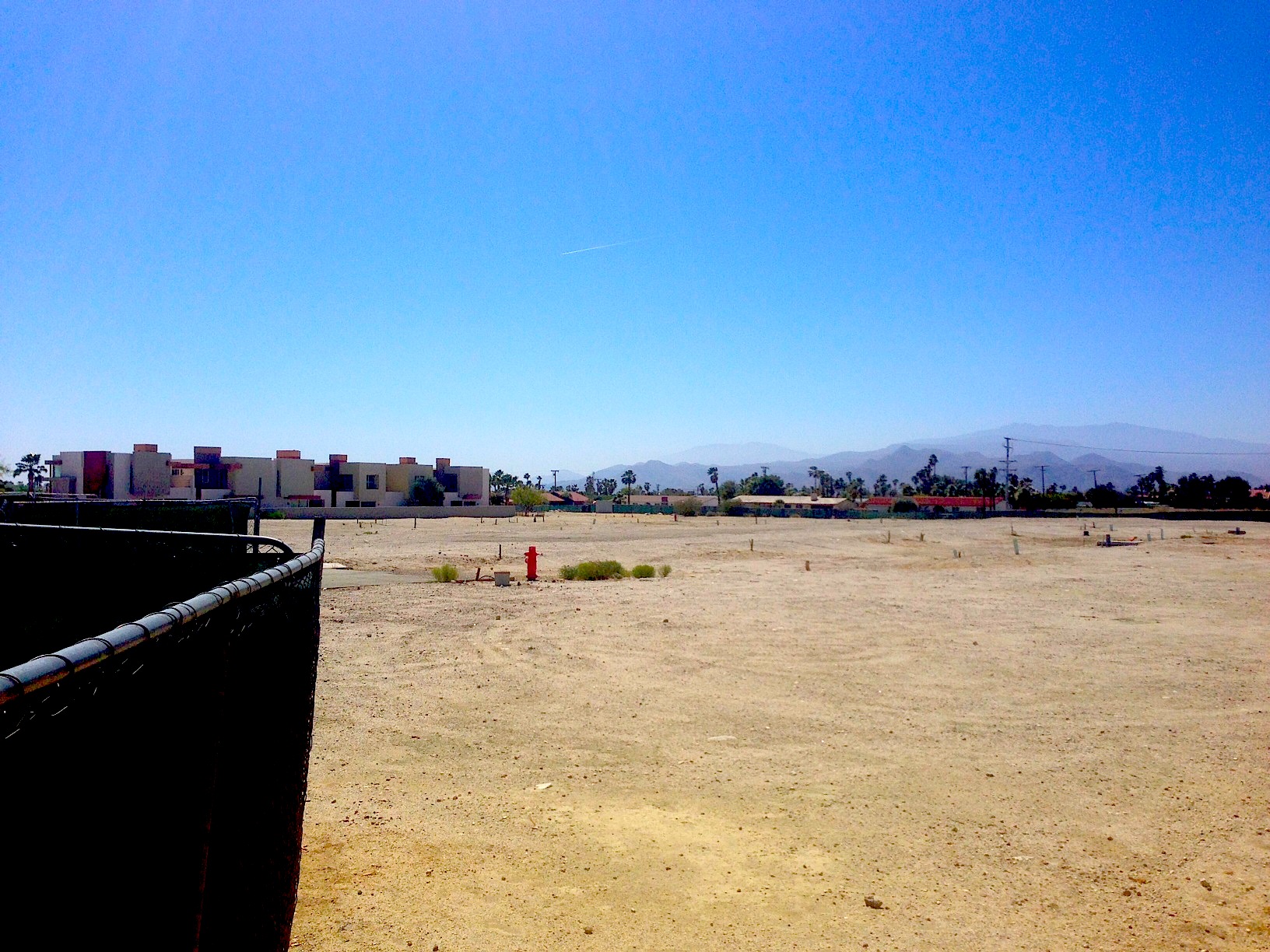Just over the fence from our home, with its exquisite desert landscaping, the desert sits ready to strike, this plot one more carcass of the recession, a parcel of land all plumbed and plotted, but nowhere to go. That is, until the mighty winds blow, then the pleasant rustle of palms on our side of the fence can become a dust storm on the other side.