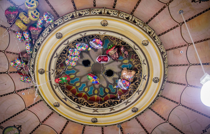 As I waited to check out (you bet!), I glanced up at the very top of the ceiling, and regarded its vibrant jazz-age era cinema decor festooned with 21st century commercialism. The smiley-faced balloons, prevented from exiting the building, resigned to gradually lose their air whilst regarding this magnificent mashup of cherubs and cheddar cheese, all of course, on sale for 99 cents.