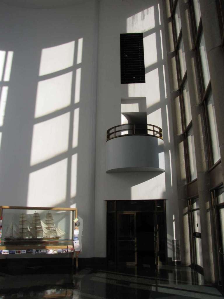 The building was designed by William Gladstone Merchant, and includes a hiring hall, large auditorium, and a lobby with magnificent scale models of sailing ships. It is a study in Nautical Moderne, streamlined detailing, portholes, horizontal windows. This still is a functioning union hall, albeit serving a smaller union. The building in some ways felt like the square rigged ships in the lobby, a preserved scale model of a larger past.