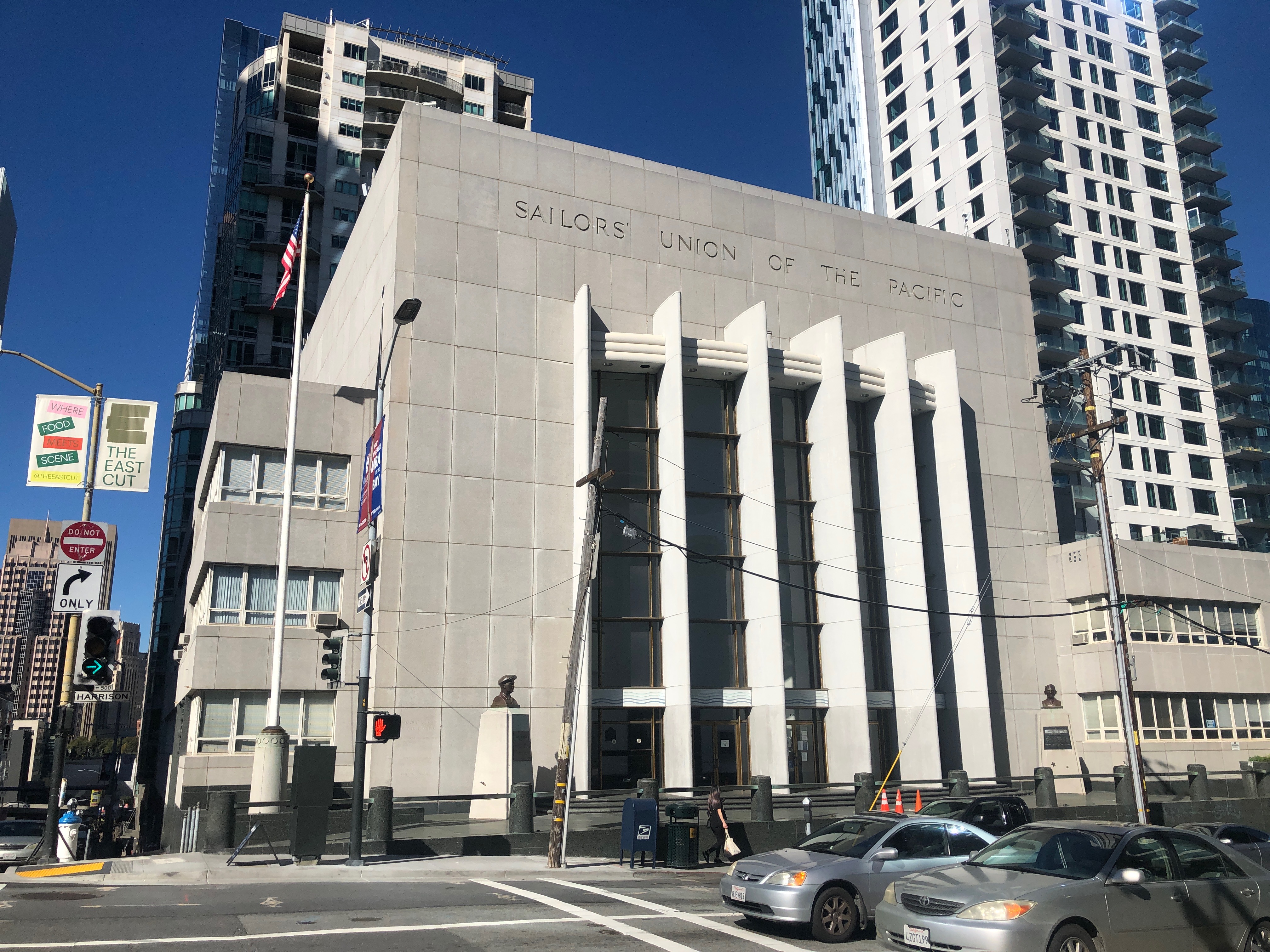 Meanwhile, across First at Harrison, the nautical past is represented by the Sailors Union of The Pacific (8), built in 1950.