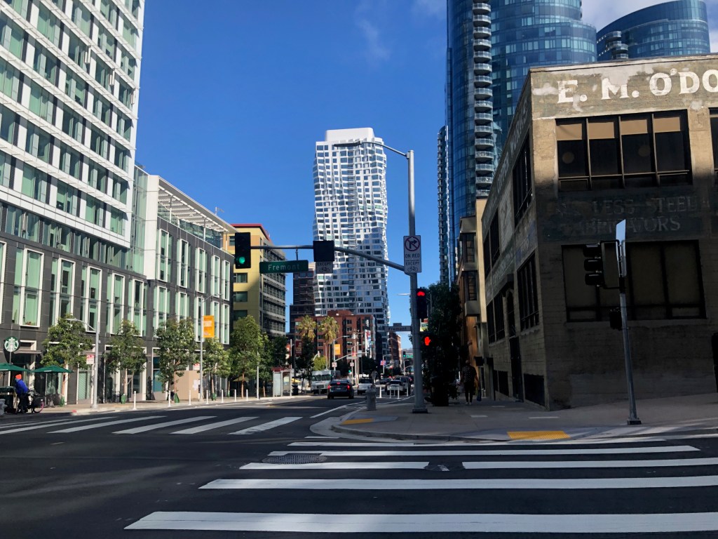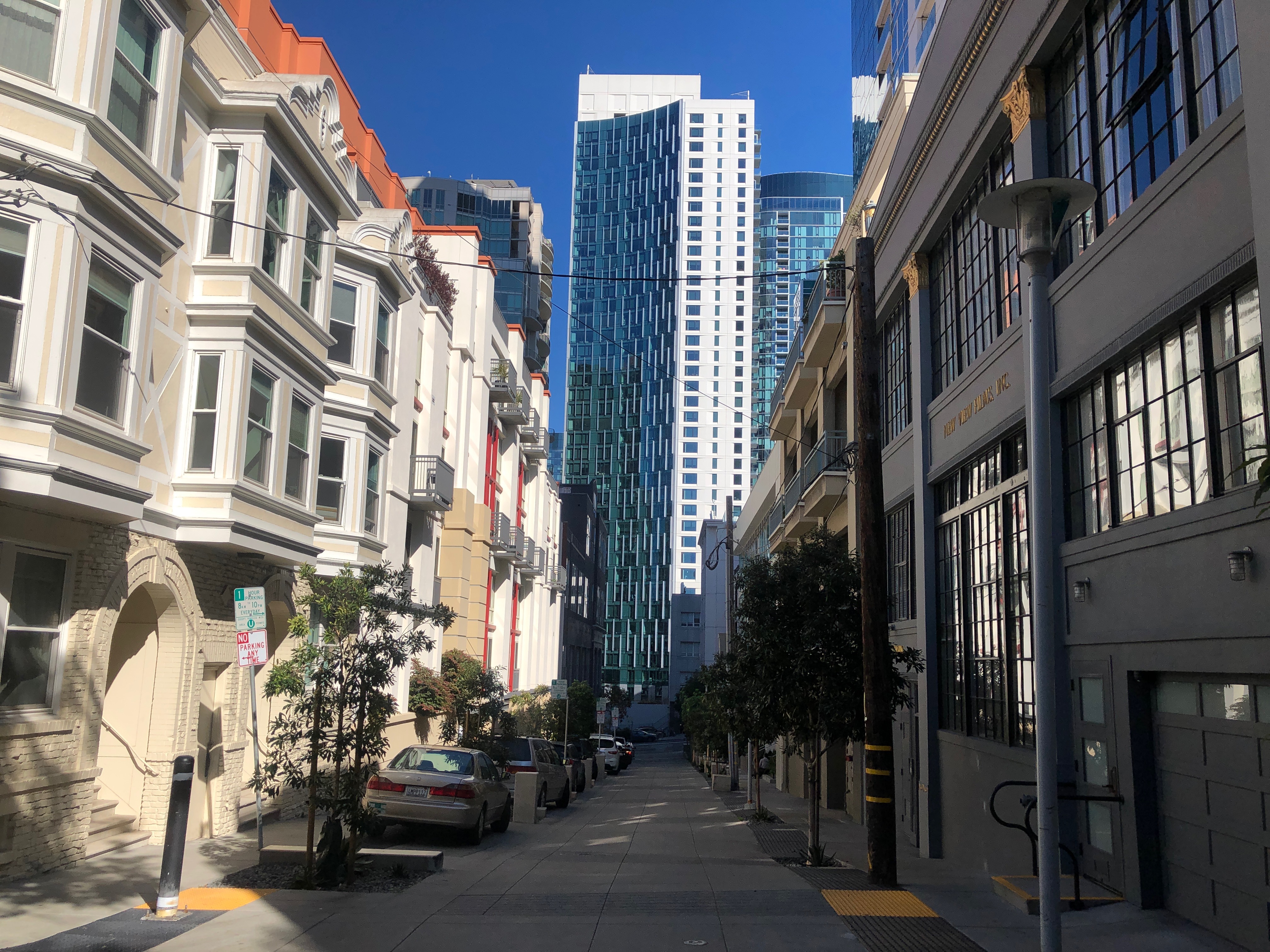 From here, one can return to Market Street along the magnificent Embarcadero, to the Ferry Building , with connections north south east and west. Along the way, there is a pier that one can walk out on, and from out at its end, offers a nice distant view of the East Cut. From here, one sees the office towers that may (or may not) be filled again with workers, the high-rise apartments with drop dead views , and those odd bits of an older San Francisco, all tumbling gently down to the Bay.
