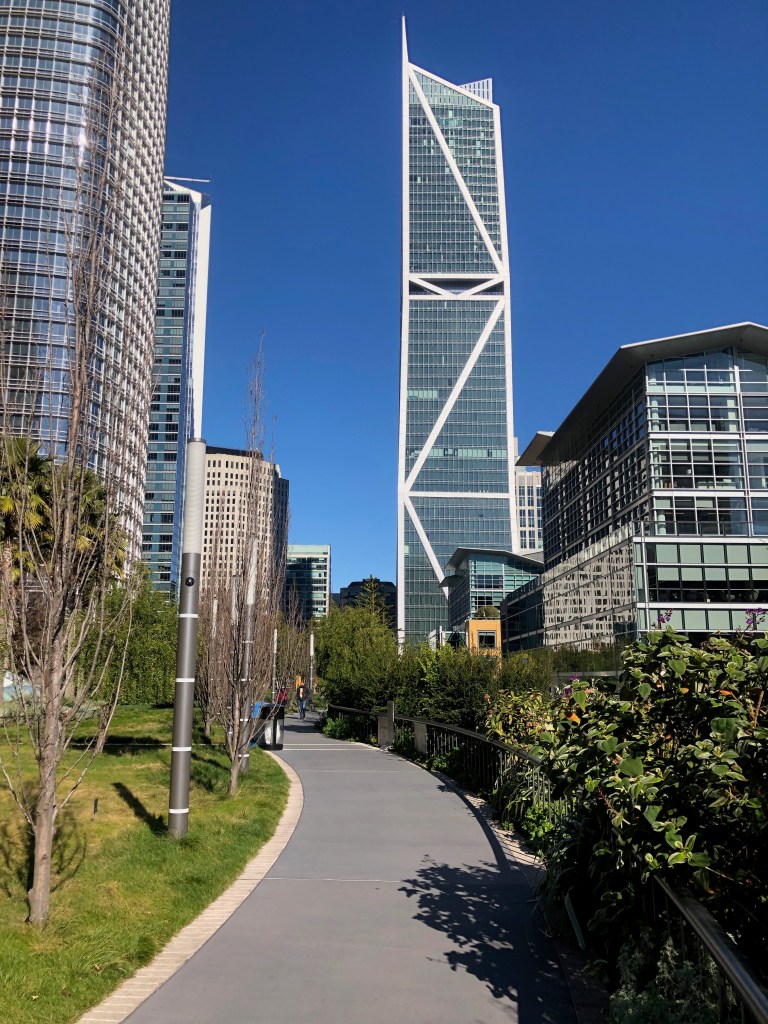 After descending from Salesforce Park, one can spend a moment at the base of the new tallest building in San Francisco, the Salesforce Tower (3). It was also designed by the office of Cesar Pelli, and like the JP Morgan building, exhibits a finely crafted skin of mullion and sunshade laid over a bowed envelope. It is very handsome.