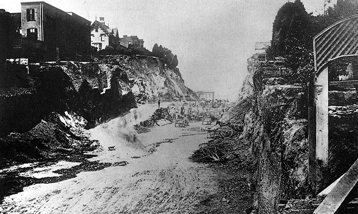The name East Cut is taken from a historical alteration of Rincon Hill. The Hill, to the right side of the map above, was a serious impediment to commerce in the area around South Beach. In 1869, one of the local landowners initiated a plan to take a significant slice out of Rincon Hill: