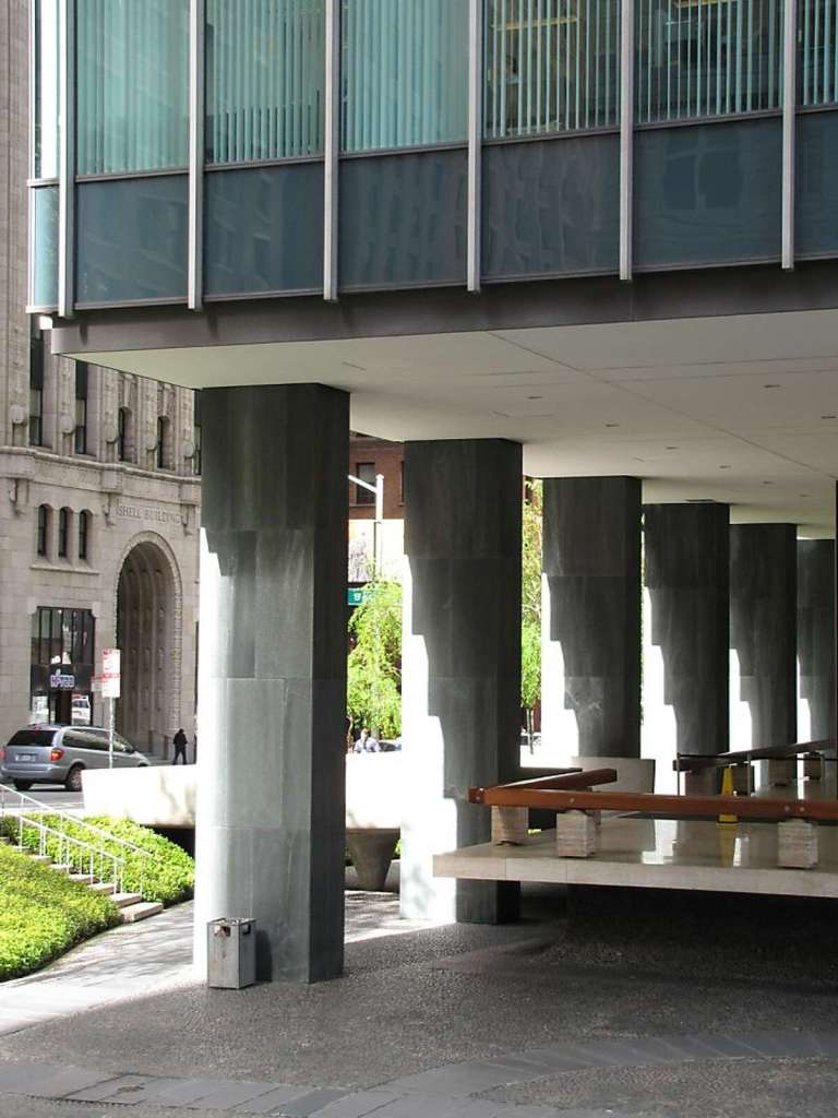 This pair a graceful testimony to early and mid-century densification of downtown San Francisco. The Shell Building respectfully anchoring its’ corner, and Crown-Zellerbach resolving its triangular lot in a very modernist way, a tower, a plaza, and a circular retail folly. This was San Francisco’s first International Style curtain wall, ala the Seagram Building in New York. Standing at this corner, one can’t regard the Crown Zellerbach building without thinking of the time it was born, the late 50s, the apogee of High Corporate Modernism. Most downtowns (San Francisco an exception) would begin a decline not long after.