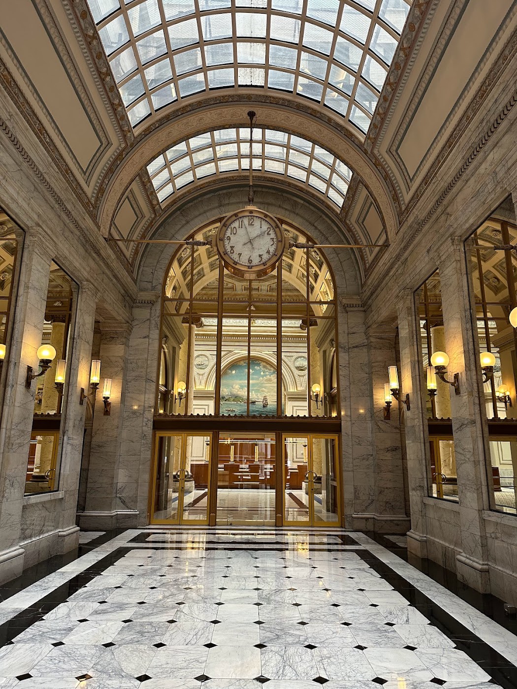 Downtown is indeed about money, and the banks went out of their way to display it. Nearby sits Chicago master architects Burnham and Root’s Merchants Exchange, who were joined by Julia Morgan on the design. The entry lobby is luxurious, and the tower court set-back above allows for the skylight., a rare thing. It feels like a train station.