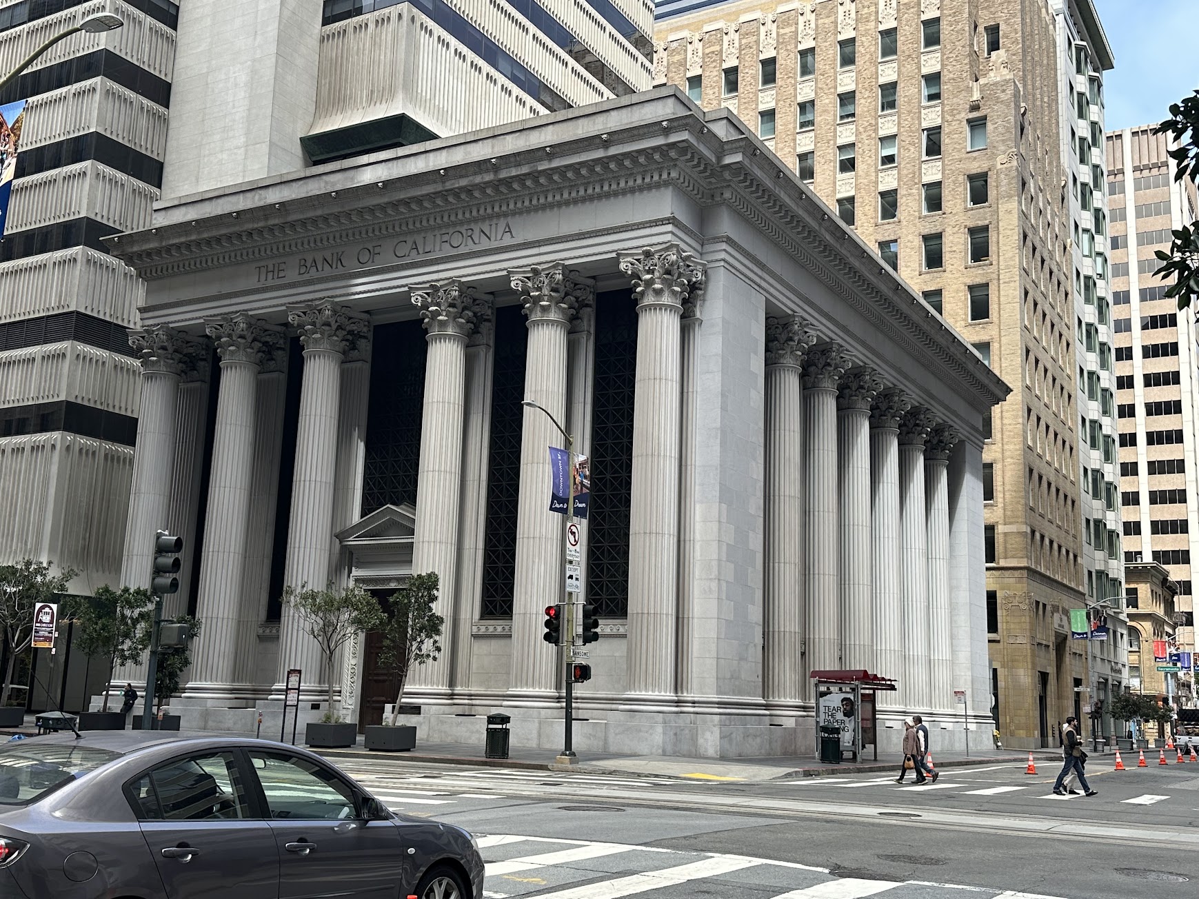 South from the park, the walk along Sansome offers a string of handsome buildings, including the Bank of California(6), at Sansome and California. one of many “Temples of Finance” downtown. When I first moved to San Francisco, I opened my bank account at another downtown bank, another “temple”, after I had secured a job. I entered the ornate hall, and at 26, thought this might be a good place to stash my riches. I was a bit intimidated- what if they found out I only had $77.00 to my name. Nonetheless I felt like a prince, spent far too much time selecting the design on my new checks (stagecoach or snow-capped peaks), signed on the dotted line, deposited my $77.00, and that was that. Such a moment should be made concrete in a Banking Temple such as this. I chose the stagecoach.