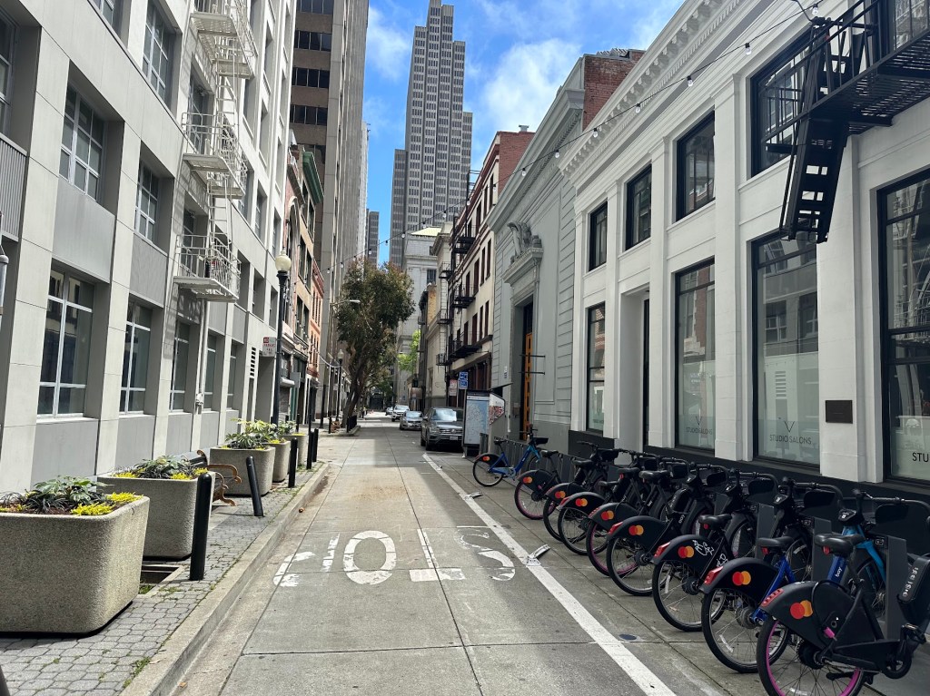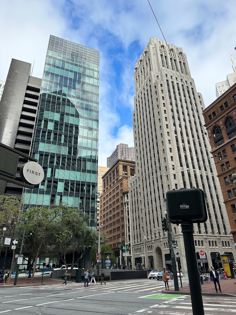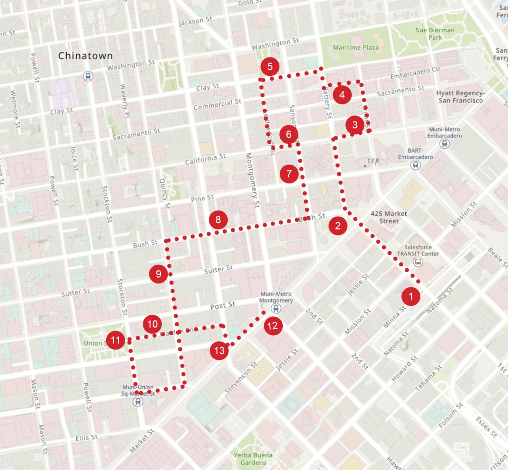 So when I heard the term doom loop, I thought…. that would make a good walk!. So this walk takes one through two parts of downtown San Francisco; the financial district (mostly office) and the edge of Union Square (mostly retail). And yes, the street-scene was at times depressing, the missed opportunities of San Francisco’s horrid planning infuriating. But rather than endless photos of empty storefronts (and there are plenty) I thought I’d try at least to focus mostly on what’s there, “the bones” if you will, and opportunities- both missed and potential. Here’s the route: