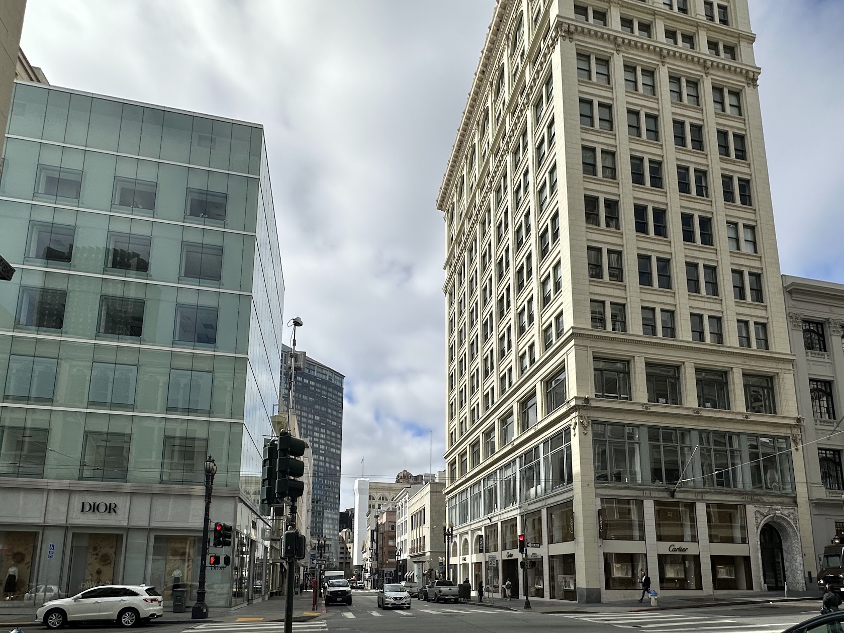 Across Kearny, we come into Union Square proper. The blocks around Grant Street (9), east of Union Square, are chock-a block with elegant retail buildings. This area contains some of San Francisco’s finest retail buildings, both restored and completely reborn. At street level, luxury retail, and above, hair salons, galleries, and other uses bathed in light from extra large windows. I recall I once was convinced that I should get my hair “done” at a third floor salon called Architects and Heroes, because, of course.. I came out looking like a poodle, and considerably poorer. I’m a simple guy, and retreated to my humble Mission District barber for repair work. I like this pair, which speak to the renewal of a neighborhood’ fabric. The building in the left 100 years old but reclad as a glass box. The upper floors of the old buildings would make great apartments.
