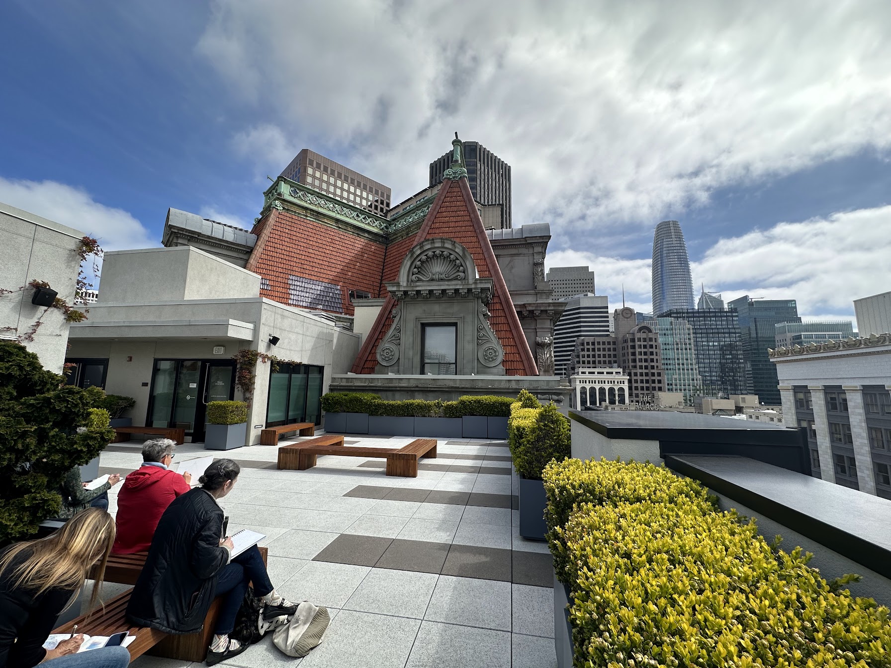 The loop was nearly over, and although not imbibing, I felt restored by the Piper, as always. Across the street, I made one final stop, up to a “POPO, the roof deck at One Kearny (13) , where one can sit and admire the skyline hard against the silhouette of the historic neighbor. This a secret spot, but much to my surprise, a group of women were on a sketching outing. They had chosen well. The foreground full of detail, and in the background, the new skyline, Salesforce Tower, the tallest building in the distance , marking where we began. We chatted at length.