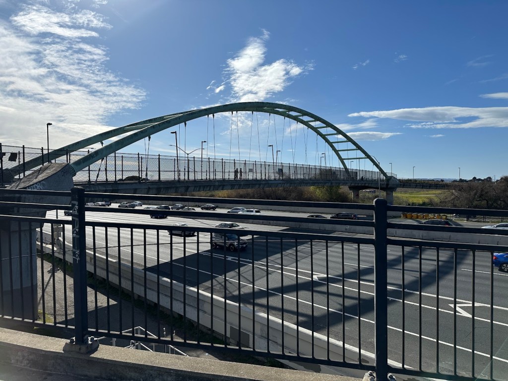 The Bayfront still does contain plenty of industry, and is a transportation workhorse. So rail and freeway must be navigated as you move inland, and you do that over a pedestrian bridge that spans the incessant drone of the oft-gridlocked I-80.